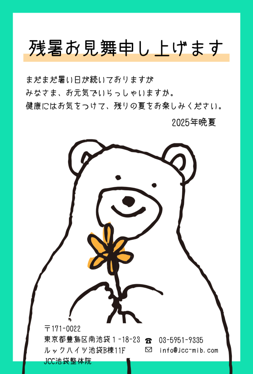 残暑お見舞い申し上げます|東京都豊島区で腰・肩・脚のお悩みはJCC池袋整体院へ